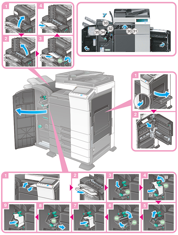 (30)、(31)、(32)、(33)、(34)、(35)で紙づまりが発生した場合は、下図の手順に従って詰まった用紙を取り除いてください。