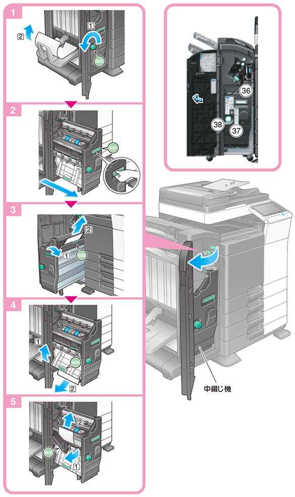 (36)、(37)、(38)で紙づまりが発生した場合は、下図の手順に従って詰まった用紙を取り除いてください。
