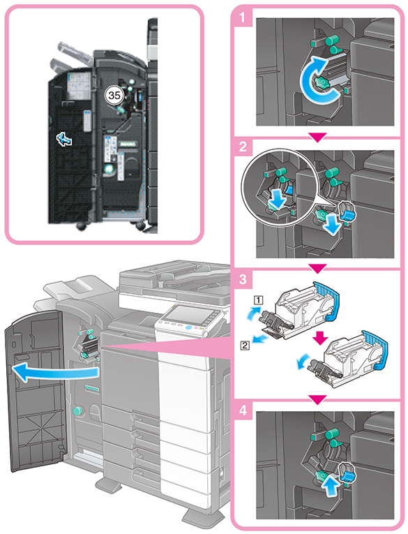 フィニッシャーで針づまりが発生した場合は、下図の手順に従って詰まった針を取り除いてください。