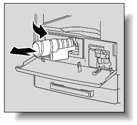 本機の前ドアを開いてトナーボトルホルダーを手前に開き、トナーボトルを引き抜きます。