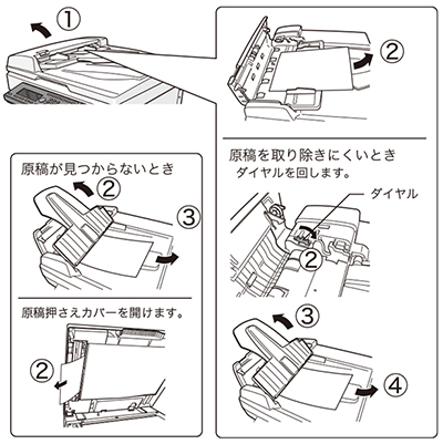 自動原稿送り装置(ADF)で紙づまりが発生した場合は、下図の手順に従って詰まった原稿を取り除いてください。