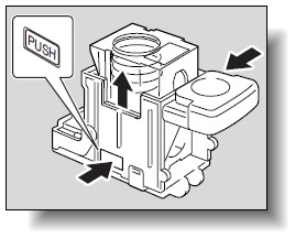 ステープルホルダ内の【PUSH】部分を押してください。ロックが解除されます。