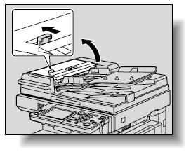 本機の原稿給紙カバーのつまみを引いて原稿給紙カバーを開き、詰まっている用紙をゆっくり引き抜いてください。
