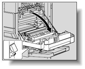 本機の右ドア解除レバーを引いて右ドアを開き、詰まっている用紙をゆっくり引き抜いてください。