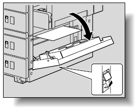 本機の右下ドアのつまみを引いてドアを開き、詰まっている用紙をゆっくり引き抜いてください。