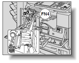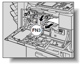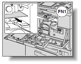 本機の前ドアを開き、レバー【FN1】を下げて用紙を取り除きます。