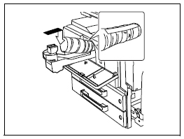 トナーホルダーをロックするまで倒し、トナーボトルのシール部を持って手前にゆっくりと引き抜いてください。