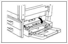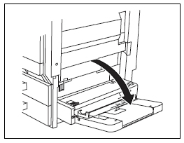 タッチパネルに表示されている箇所の右下ドアのつまみを引いてドアを開き、詰まっている用紙をゆっくり引き抜いてください。