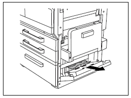 本機の右下ドアのつまみを引いてドアを開き、詰まっている用紙をゆっくり引き抜いてください。