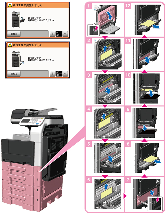 給紙トレイで紙づまりが発生した場合は、下図の手順に従って詰まった用紙を取り除いてください。