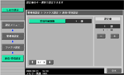 【設定メニュー/ カウンター】キーを押し、[ファクス設定]→[送信/受信設定]→[受信印刷部数]で、1~10枚の範囲で設定することが可能です。