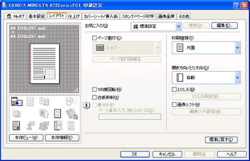 ドライバーの「レイアウト」タブをクリックして開き、「開き方向/とじ方向」の設定をプリントする原稿に合わせて変更してください。