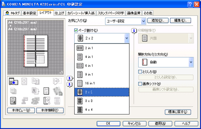 1 枚の原稿を複数の用紙に分割して印刷する機能があります。ドライバーの「レイアウト」タブの中にある「ページ割付」で、「2×2、3×3、4×4」のいずれかを選択してください。