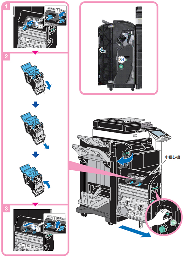 下図の手順に従って詰まった針を取り除いてください。