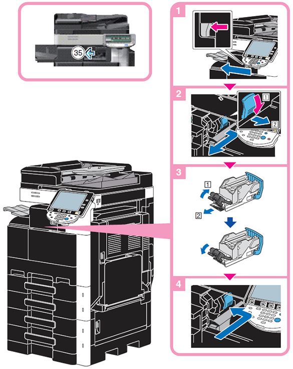 けがをする恐れがありますので、ステープルの針づまり処理にはご注意ください。