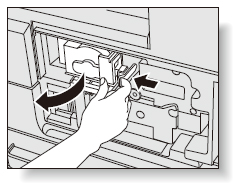 トナーカートリッジホルダーの取手を持ち、トナーカートリッジホルダーが止まるまで手前に引き出してください。使用済みのトナーカートリッジを手前に持ち上げて取り出します。