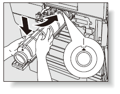 新しいトナーカートリッジのキャップを取り外し、向きに注意して新しいトナーカートリッジの奥側を先にトナーカートリッジホルダーにセットします(トナーカートリッジの▼マークを上に向けてセットします)。