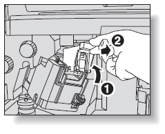 ステープルカートリッジの交換は必ずメッセージが表示された後に行ってください。メッセージが表示される前にステープルカートリッジを取り外してしまうと故障の原因となりますので、ご注意ください。