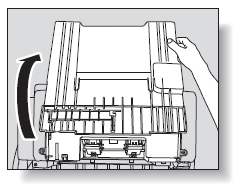 中とじ機の排紙トレイを上方に開き、保持します。手を放すと勢いよく閉じられ、思わぬ事故になることがありますのでご注意ください。