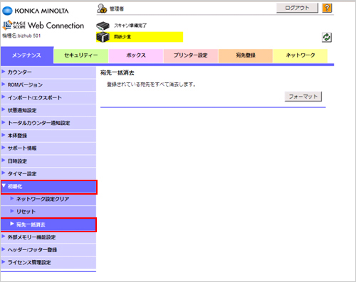 PageScope Web Connection の管理者設定画面を開き、「システムタブ」→「初期化」→「短縮宛先」で一括削除が可能です。