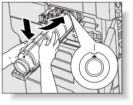 新しいトナーカートリッジのキャップを取り外し、向きに注意して新しいトナーカートリッジの奥側を先にトナーカートリッジホルダーにセットします(トナーカートリッジの▼マークを上に向けてセットします)。