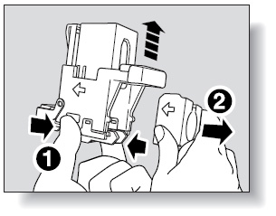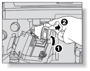 ステープルケースを元の位置に押し戻してから、ステープルカートリッジのロックテープを取り除いてください。ステープルホルダーをステープラーに“カチッ”と音がするまで押し込み、フィニッシャー前ドアを閉じます。