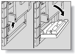 本機の右下ドア解除レバーを引き、右下ドアを開いて詰まった用紙を取り除きます。