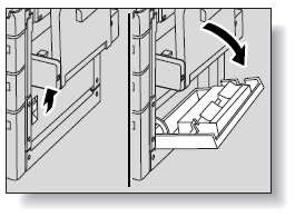 本機の右下ドア解除レバーを引き、右下ドアを開いて詰まった用紙を取り除きます。