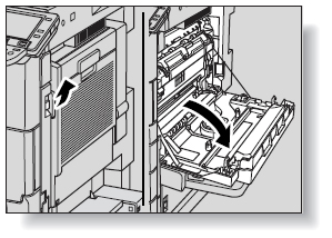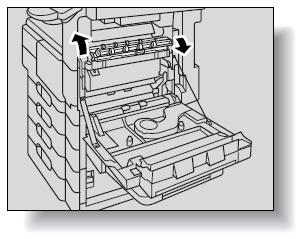 - 本体右ドア内部の定着部は高温になっています。やけどをするおそれがありますので、紙づまり処理時にこの付近に手を触れないようにしてください。