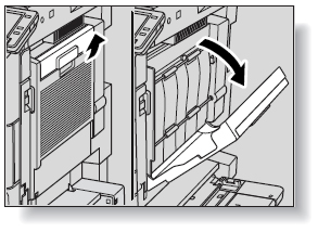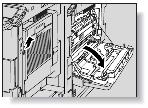 次に本機の右ドア解除レバーを引き、右ドアを開いて詰まった用紙を取り除いてください。