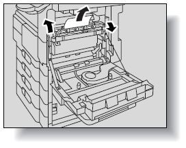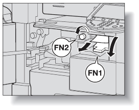 フィニッシャー前ドアを開いてガイド板FN1を下げ、ツマミFN2を左に回して詰まった用紙を取り除きます。