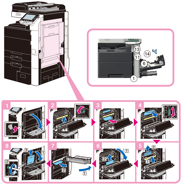 右ドア部で紙づまりが発生した場合は、下図の手順に従って詰まった用紙を取り除いてください。