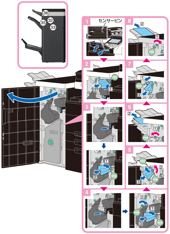 (32)、(33)、(35)、(36)で紙づまりが発生した場合は、下図の手順で詰まった用紙を取り除いてください。