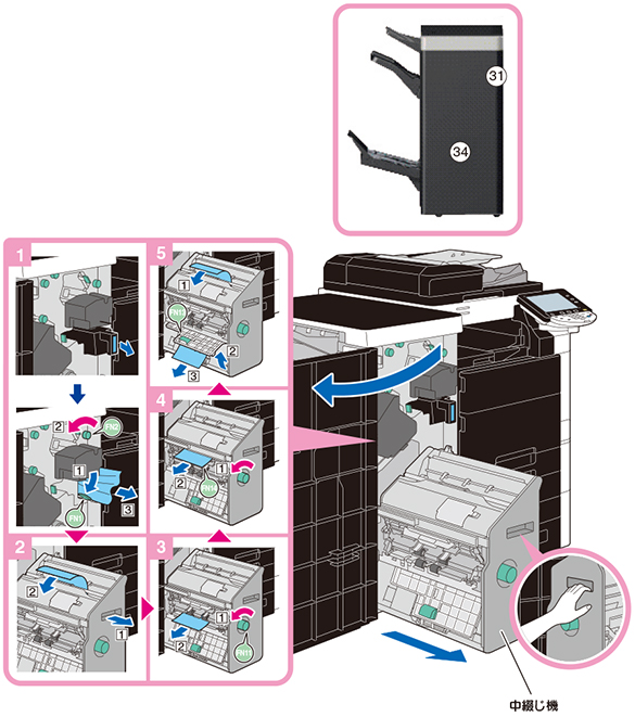 (31)、(34)で紙づまりが発生した場合は、下図の手順で詰まった用紙を取り除いてください。