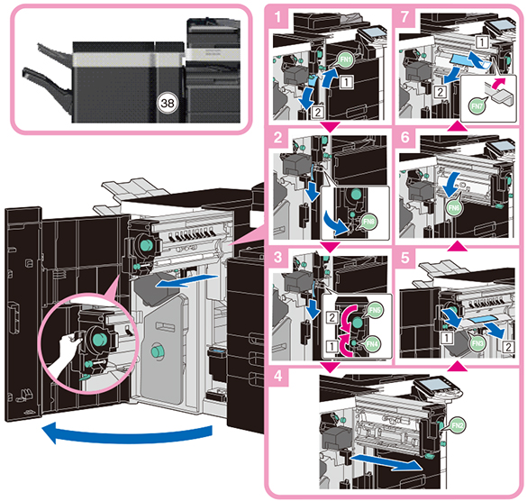 (38)で紙づまりが発生した場合は、下図の手順で詰まった用紙を取り除いてください。