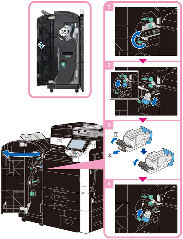 フィニッシャーFS-527で針づまりが発生した場合は、下図の手順に従って詰まった針を取り除いてください。