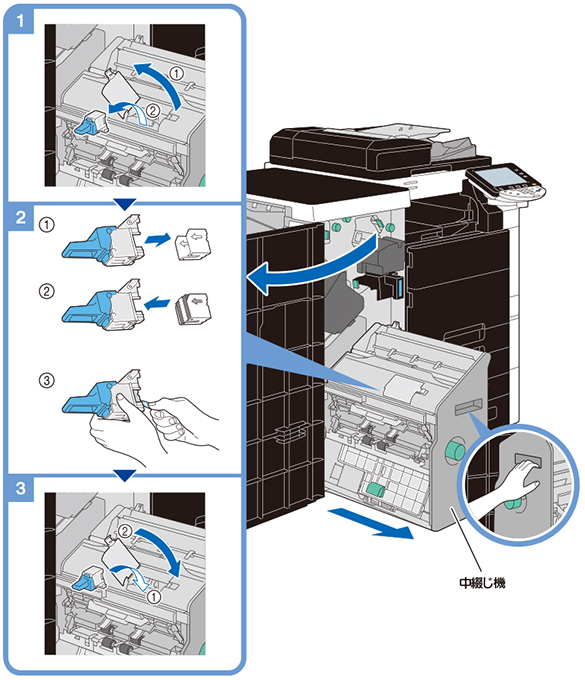 中綴じ機SD-508のステープルカートリッジの交換は、下図の手順に従って行ってください。
