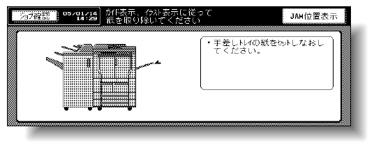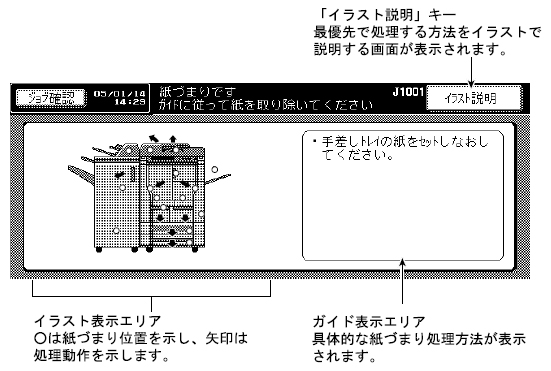 JAM位置表示画面の〔イラスト説明〕を押します。イラスト説明画面の指示に従って、紙づまり処理を行ってください。紙づまり箇所が複数の場合は、JAM位置表示画面に戻ります。次に処理すべき箇所とメッセージを確認し、処理を行ってください。