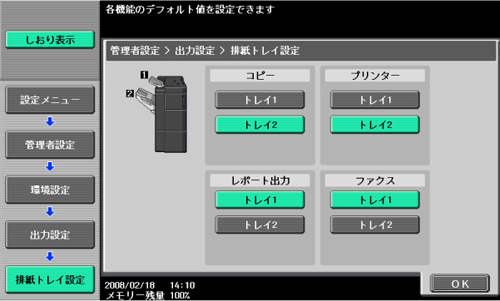 コピー・プリント・ファクスの優先排紙先は、「設定メニュー/カウンター」キーを押し、「管理者設定」→「環境設定」→「出力設定」→「排紙トレイ設定」で指定することが可能です。