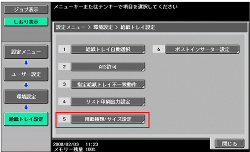 変更する場合は「ユーザー設定」→「環境設定」→「給紙トレイ設定」→「用紙種類設定」で変更してください。