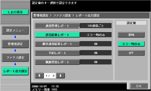 「常時」に設定すると通信ごとにレポートが出力され、「エラー時のみ」にするとエラー時にレポートが出力されます。また、OFFに設定すると、予約レポート類のすべてが出力されなくなります。