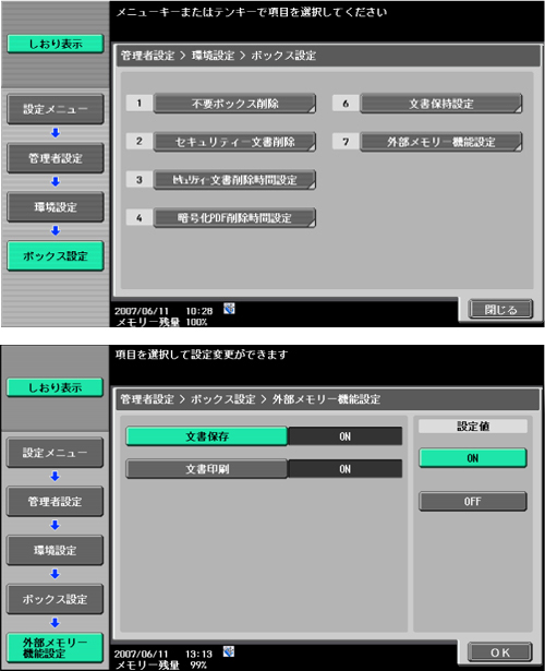 「設定メニュー」→「管理者設定」→「ボックス設定」で「外部メモリー設定」画面を開きます。スキャンデータを保存したい場合は「文書保存」をONにしてください。USBメモリー内のデータを印刷したい場合は「文書印刷」をONにしてください。