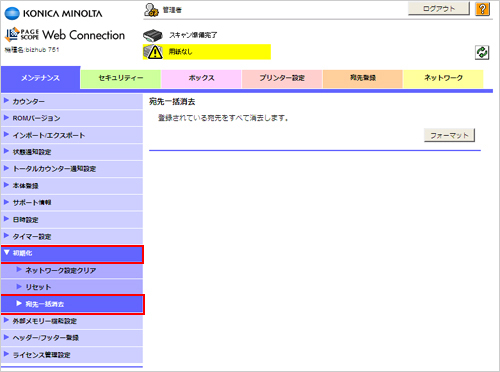 PageScope Web Connection の管理者設定画面を開き、「システムタブ」→「初期化」→「短縮宛先」で一括削除が可能です。