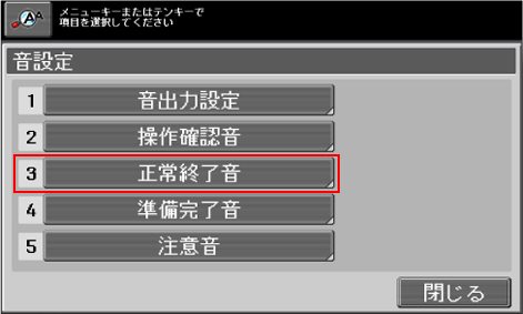「ユニバーサル設定画面」を開き、「音設定」→「正常終了音」→「操作終了音」の順に押して、「操作終了音」をOFFにしてください。