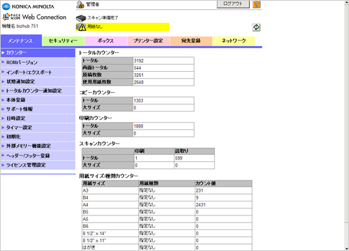 PageScope Web Connectionを使用しての確認が可能です。また、管理者モードにログインし、「トータルカウンター通知設定」でメールアドレスを設定をすると、E-mailでカウンターを取得することができます。