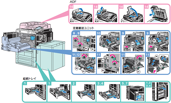 本機部(ADF/定着搬送ユニット/給紙トレイ)で紙づまりが発生した場合は、それぞれ下図の手順に従って詰まっている用紙を取り除いてください。