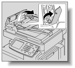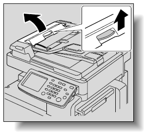 原稿ガイド側につまっている場合は、原稿ガイドの手前側のツマミを持上げて原稿ガイドを開き、詰まっている用紙を取り除きます。