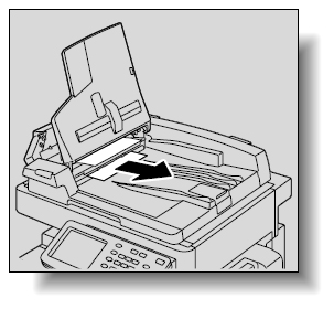 次に、原稿給紙トレイを止まる位置まで上げ、詰まっている用紙をゆっくり取り除いてください。