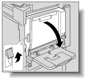 右上ドア解除レバーを引いて右上ドアを開き、続いて内部ドア【M1】を開いて詰まっている用紙を取り除いてください。