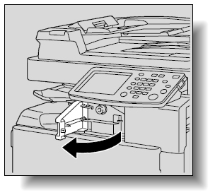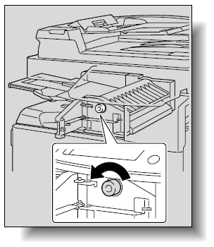 紙づまり処理ドアを開き、ダイアルを回して用紙を送り出します。排紙トレイの用紙を取り除いてから紙づまり処理ドアを閉じます。